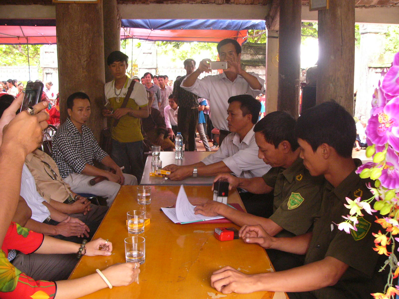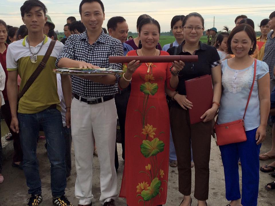 Đại diện nhóm Tâm Phát và trưởng thôn Tràng bàn giao sắc phong và giới thiệu nội dung sắc phong cho toàn thể bà con.